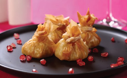 - Επαναλαμβάνετε φτιάχνοντας πουγκιά μέχρι να τελειώσει η γέμιση και τα φύλλα. Στη συνέχεια τα δένετε με λεπτό σπαγκάκι ή με ένα φύλλο φρέσκου τσάιβ. Τοποθετείτε τα πουγκιά σε ελαφρώς βουτυρωμένο ταψί, τα αλείφετε με λιωμένο βούτυρο και τα ψήνετε σε προθερμασμένο φούρνο στους 170° C μέχρι να ροδίσουν τα φύλλα.