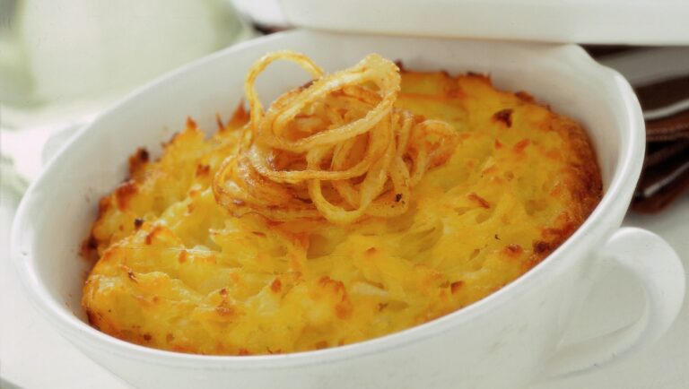 - Ζεσταίνετε το μισό βούτυρο και σοτάρετε το κρεμμύδι μέχρι να πάρει ξανθό χρώμα. Καθαρίζετε και κόβετε τη σελινόριζα σε τέταρτα και στη συνέχεια κάθε τέταρτο σε φέτες. Βράζετε τις φέτες 30΄, τις στραγγίζετε και τις πολτοποιείτε στη μηχανή του πουρέ. Κατόπιν τρίβετε τις φλούδες από τις πατάτες με συρμάτινο σφουγγαράκι και τις πλένετε καλά. Τις βράζετε 40΄, αφαιρείτε τις φλούδες τους και τις πολτοποιείτε στη μηχανή του πουρέ.