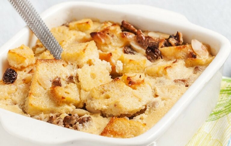 - Αλείφουμε με βούτυρο μια μέτρια σε μέγεθος και ρηχή φόρμα για κέικ. Απλώνουμε τα κομμάτια του ψωμιού, τις σταφίδες, τα αμύγδαλα και τα καρύδια.
