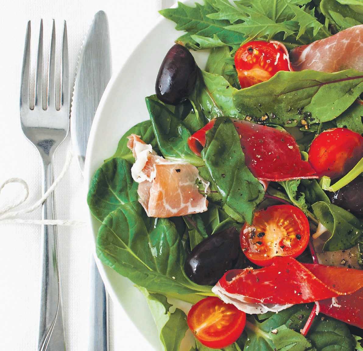 - Βάζετε σε βαθιά σαλατιέρα τα νεαρά φύλλα ρόκα και σπανάκι μαζί με τις λωρίδες από το προσούτο, τα ντοματίνια κομμένα στη μέση, τις ελιές και το κουκουνάρι (προαιρετικά) και ανακατεύετε απαλά.