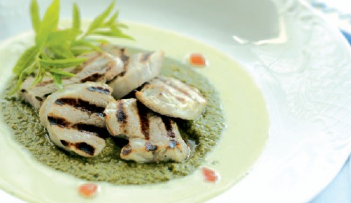 - Αλείφετε το ψαρονέφρι με λίγο λάδι και αλατοπιπερώνετε. Το ψήνετε στη σχάρα και μόλις είναι έτοιμο σερβίρετε τη σάλτσα σε 4 πιάτα. Στο κέντρο κάθε πιάτου βάζετε από μια κουταλιά μους κολοκυθιού και από πάνω τοποθετείτε το ψαρονέφρι. Ραντίζετε με μερικές σταγόνες ελαιόλαδο και στολίζετε με ένα κλαδάκι λουίζας.