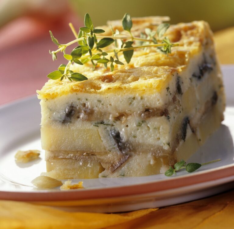 Ένας ωραίος, vegetarian μουσακάς, με πατάτες, μανιτάρια και πλούσια κρέμα σιμιγδαλιού.