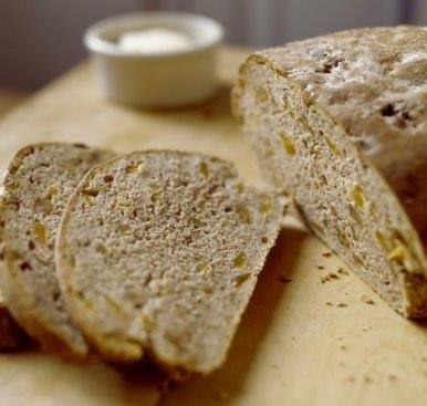- Χαράζετε το καρβέλι με μαχαίρι σταυρωτά και το αλείφετε με το υπόλοιπο βούτυρο. Ψήνετε σε προθερμασμένο στους 180° C για 45-50' μέχρις ότου το ψωμί να φουσκώσει και να ροδοψηθεί. Το βγάζετε από το φούρνο και το ακουμπάτε στη σχάρα να κρυώσει.