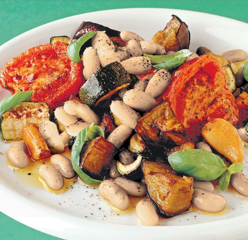 - Τα σκεπάζετε με αλουμινόχαρτο και τα ψήνετε σε προθερμασμένο φούρνο στους 200 οC για 1 ώρα. Αφαιρείτε κατόπιν το αλουμινόχαρτο, προσθέτετε τα φασόλια χάντρες, ανακατεύετε προσεκτικά τα λαχανικά με τα φασόλια και αφήνετε να ψηθούν όλα μαζί για 5’-6’ ακόμα.