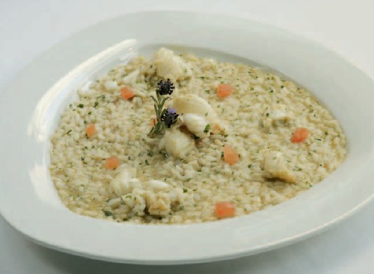 Το ιωδιούχο, γλυκόσαρκο θαλασσινό γνέφει προκλητικά στο νωθρό, αμυλούχο ρύζι που χυλώθηκε με την πιπεράτη γοητεία της παρμεζάνας. Γλύκα, όγκος, λιπαρότητα είναι το αποτέλεσμα της φιλήδονης περιπλάνησης. Βουτυράτο, αρωματικό Chardonnay και λιπαρό, πλούσιο σε αλκοόλ Viogner, αγκαλιάζουν τρυφερά τη θαλασσινή ντίβα.