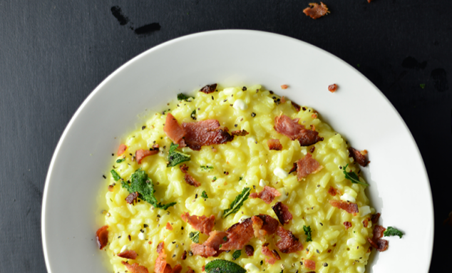 - Ανακατεύετε για 2' ακόμη. Σερβίρετε και προσθέτετε το ψιλοκομμένο μπείκον και το φασκόμηλο.