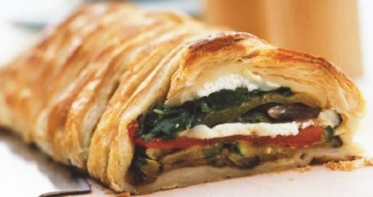 Συνταγή για λαχταριστό ρολό λαχανικών με μπέικον σε τραγανή, ροδοψημένη σφολιάτα. Κλεισμένη στο αέρινο φύλλο, μια πανδαισία λαχανικών, ενισχύεται από το αρωματικό βούτυρο της σφολιάτας, το μπέικον, την κρέμα γάλακτος και τη φέτα, δημιουργώντας ένα λαχταριστό σύνολο που γεμίζει πληθωρικά τον ουρανίσκο. Αν αναζητείτε ένα κρασί να την απολαύσετε, αυτό θα μπορούσε να είναι και ένα γενναιόδωρο ροζέ, κατά προτίμηση από Syrah.