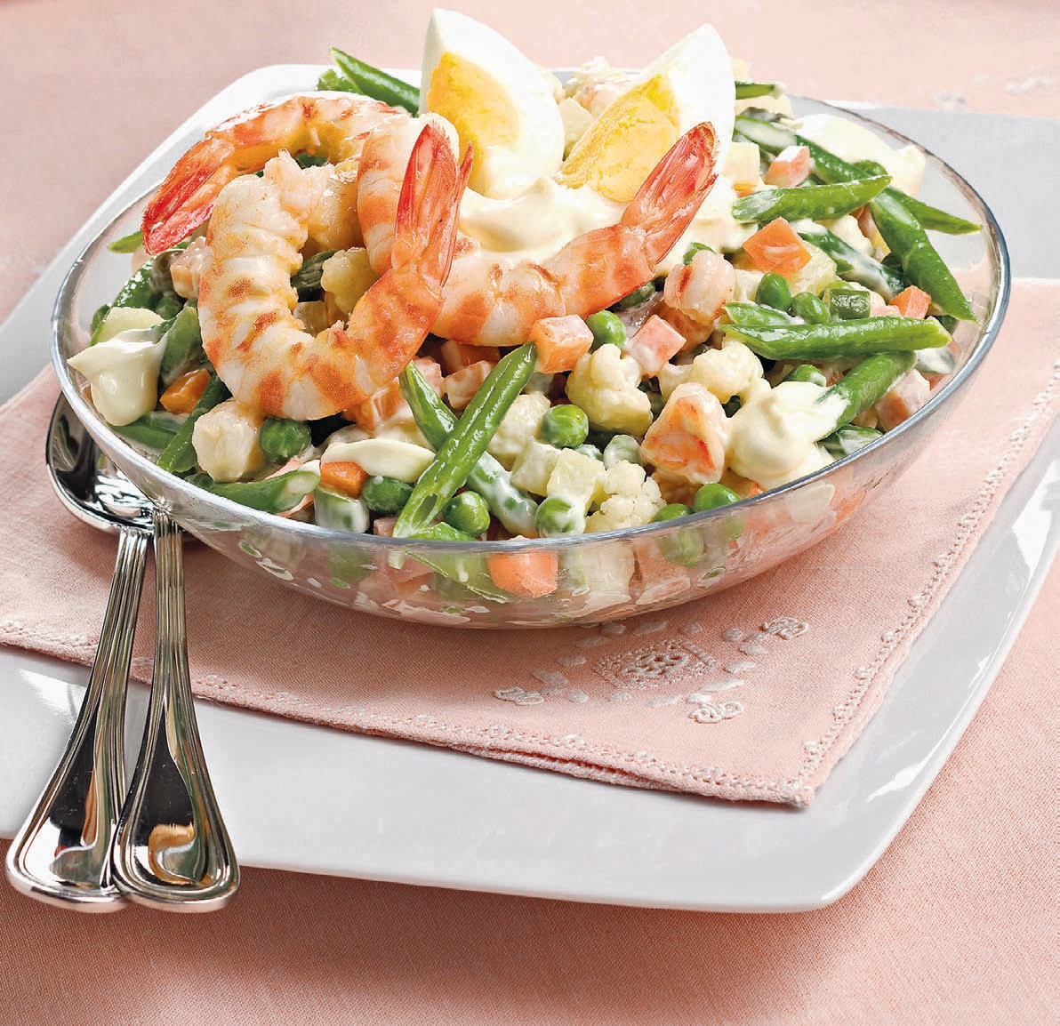 - Ανακατεύετε τη μαγιονέζα με το μείγμα λαχανικών και γαρίδων και αφήνετε την σαλάτα στο ψυγείο. Την τελευταία στιγμή γαρνίρετε με τις ολόκληρες γαρίδες που κρατήσατε στην άκρη και το δεύτερο βραστό αυγό κομμένο στα τέσσερα.