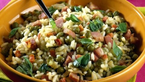 Συνταγή για πλούσιο ρύζι με κοτόπουλο, ζαμπόν και αρακά. Χορταστικό πιάτο για το καθημερινό τραπέζι που αρέσει και στα παιδιά.