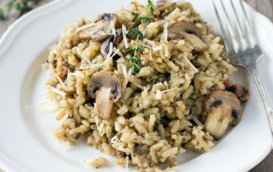 - Αν συνεχίσετε με ρύζι για ριζότο, ρίχνετε 1 /2 με 2 φλιτζάνια του τσαγιού ζεστό ζωμό στο μείγμα μανιταριών, προσθέτετε το ρύζι και το αφήνετε να βράζει σε μέτρια φωτιά ανακατεύοντας συστηματικά και ελέγχοντας την ποσότητα των υγρών. Καθώς το ρύζι θα απορροφάει το ζωμό θα προσθέτετε νέο, μέχρι να καλύψετε το χρόνο βρασμού που δίνει η συσκευασία του ρυζιού που χρησιμοποιήσατε. Κατεβάζετε το φαγητό απ' τη φωτιά όταν απορροφηθεί κι η τελευταία δόση ζωμού και το ριζότο αποκτήσει το γνωστό χύλωμα. Προσθέτετε -αν θέλετε- λίγο βούτυρο ή κρέμα γάλακτος, ανακατεύετε, πασπαλίζετε με το μαϊντανό και κεφαλοτύρι και σερβίρετε.