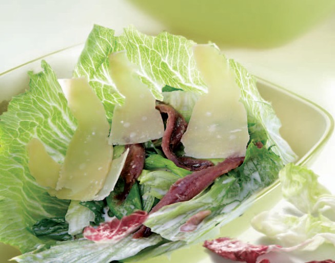 - Αδειάζετε το μείγμα σε ένα μπολ και προσθέτετε τις αντσούγιες, το λεμόνι, το σκόρδο, τη μουστάρδα και το αλατοπίπερο. Ανακατεύετε σε ένα μπολ τη σαλάτα άισμπεργκ με τη σάλτσα αντσούγιας και προσθέτετε τις φλούδες παρμεζάνας.