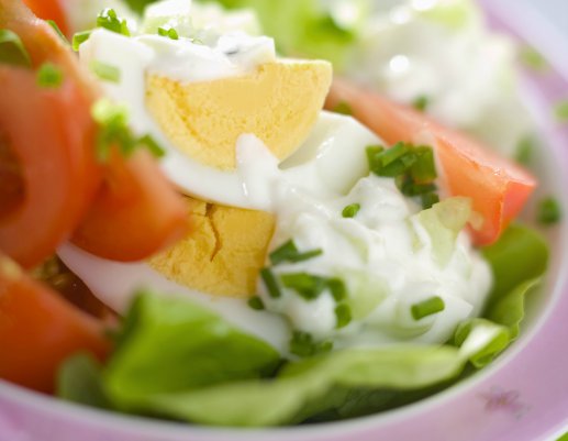- Χτυπάτε σε μπολ το γιαούρτι, τη μαγιονέζα, το ξίδι, τη μουστάρδα, το αλάτι και το πιπέρι μέχρι να ομοιογενοποιηθούν. Προσθέτετε στη σαλάτα τη σάλτσα γιαουρτιού τη στιγμή που θα τη σερβίρετε.