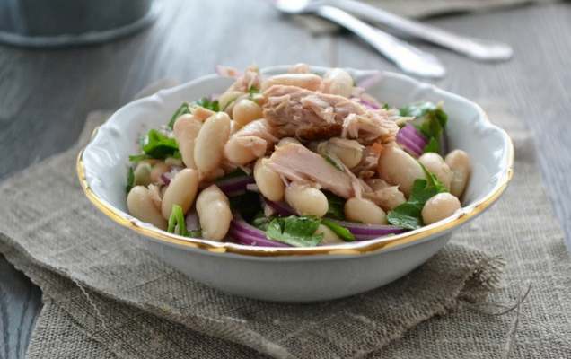 - Στο μπλέντερ ρίχνετε το υπόλοιπο λάδι, το μισό τόνο, τη μουστάρδα, το χυμό λεμονιού και τα χτυπάτε μέχρι να γίνουν ομοιόμορφη σάλτσα. Περιχύνετε με το μείγμα τους γίγαντες, σκορπίζετε το τρίτο κρεμμύδι σε φέτες, προσθέτετε τον υπόλοιπο τόνο, πασπαλίζετε με το υπόλοιπο μυρωδικό, ανακατεύετε και σερβίρετε τη σαλάτα αμέσως.
