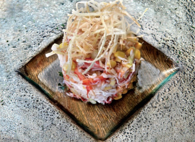 - Βράζετε το καλαμπόκι για 10’ σε αλατισμένο νερό και το στραγγίζετε. Το αφήνετε να κρυώσει. Κομματιάζετε την καβουρόψιχα και τη ρίχνετε σε ένα μπολ. Προσθέτετε στο μπολ το καλαμπόκι, το μάνγκο και το σέλερι, αλατοπιπερώνετε, προσθέτετε και το ελαιόλαδο και τα ανακατεύετε μέχρι να ομοιογενοποιηθούν.