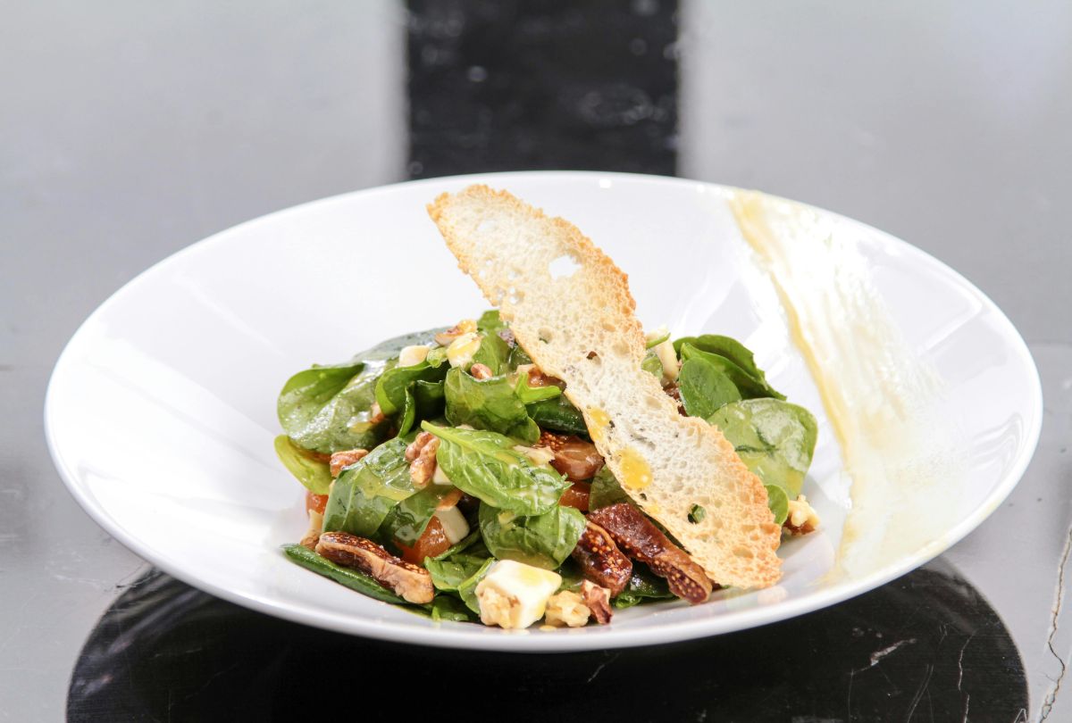Συνταγή για σαλάτα με σπανάκι, φρέσκα ή ξερά σύκα, καρύδια και φρυγανισμένο ψωμί. Δροσερό και θρεπτικό πιάτο γεμάτο γεύση, φυτικές ίνες και βιταμίνες.