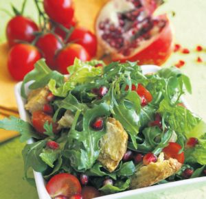 - Σπάζετε και ανοίγετε το ρόδι και αφαιρείτε τους σπόρους του. Σκορπίζετε τα ρόδια πάνω στη σαλάτα και σερβίρετε.