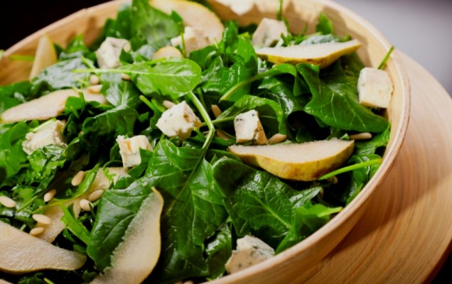 - Καβουρδίζετε το κουκουνάρι σε αντικολλητικό τηγάνι. Ρίχνετε σε σαλατιέρα τα φύλλα απ' το σπανάκι, τα αχλάδια, τα φρέσκα κρεμμυδάκια και το μπλε τυρί και τα ανακατεύετε.