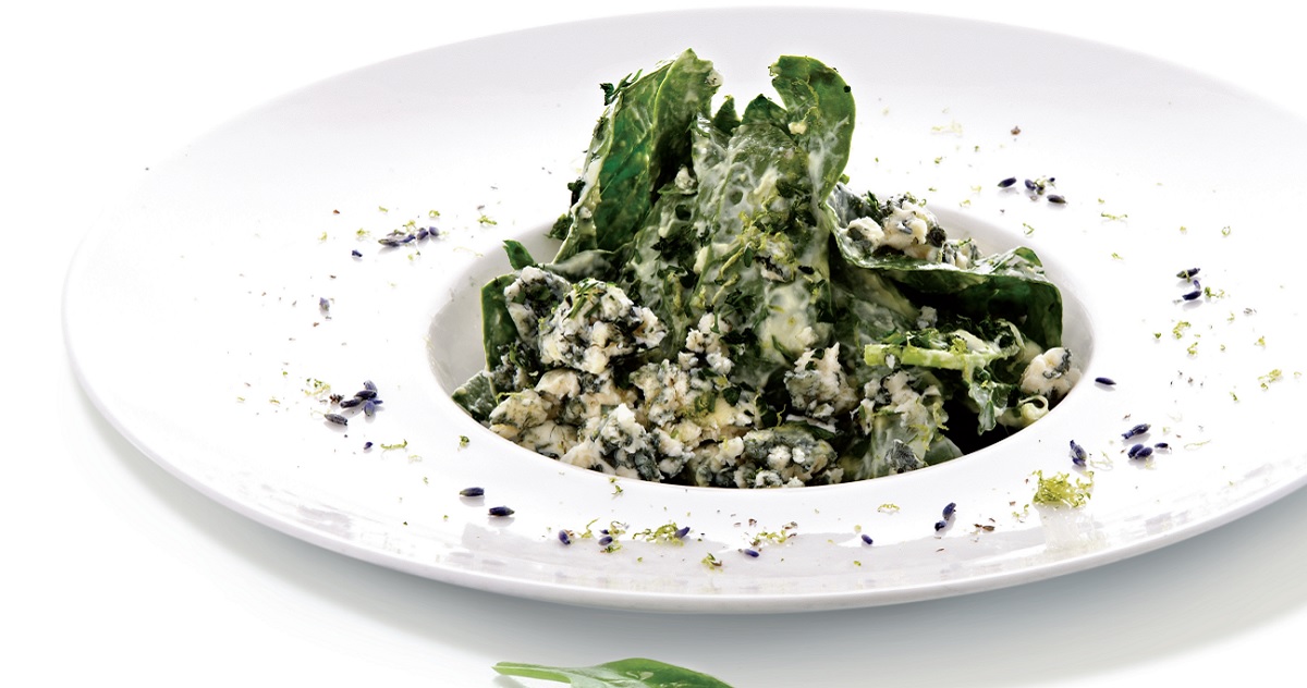 - Βάζετε σε ένα μπολ τα φύλλα από το σπανάκι. Τρίβετε με τα χέρια σας το μπλε τυρί πάνω από τη σαλάτα. Σε ένα μπλέντερ βάζετε τα αβοκάντο καθαρισμένα και το γιαούρτι και τα πολτοποιείτε μέχρι να γίνουν ντρέσινγκ.