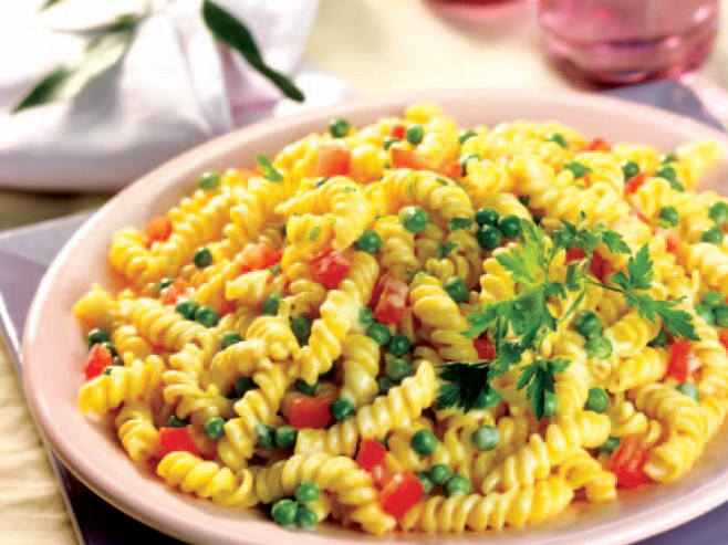 - Παράλληλα βράζετε σε άλλα σκεύη τον αρακά και το καλαμπόκι για περίπου 6’-8’. Τα στραγγίζετε και τα ρίχνετε στη σαλατιέρα με τα ζυμαρικά και προσθέτετε τις πιπεριές και τα φρέσκα κρεμμύδια.