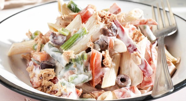 - Μεταφέρετε τα ζυμαρικά σε ένα μπολ και προσθέτετε το χυμό λεμονιού, τις ντομάτες, τα φασολάκια, τις ελιές, τις πιπεριές, τα κομματάκια του τόνου και το γιαούρτι.