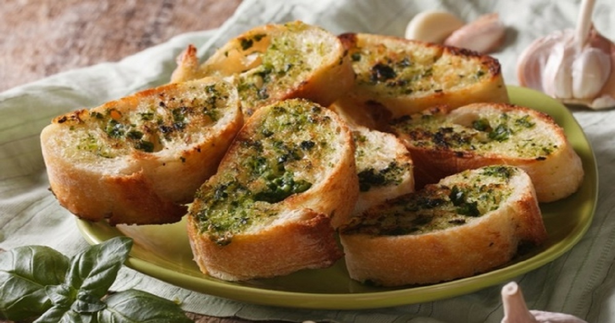 - Κόβετε την μπαγκέτα ή το ψωμί σε σε φέτες χωρίς να φτάσετε το μαχαίρι κάτω κάτω και σας ανοίξει η φρατζόλα. Αλείφετε ενδιάμεσα τις φέτες με το μείγμα βουτύρου-σκόρδου-βασιλικού. Αν περισσέψει μείγμα αλείφετε λίγο και την επιφάνεια.