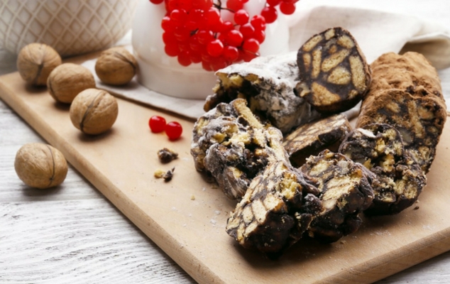 Απ’ τα πιο δημπφιλή γλυκίσματα της σπιτικής ζαχαροπλαστικής εδώ και δεκαετίες. Συνταγή για σπιτικό κορμό, μωσαϊκό ή «σαλάμι» με κουβερτούρα, πτι μπερ, κονιάκ και καρύδια.
