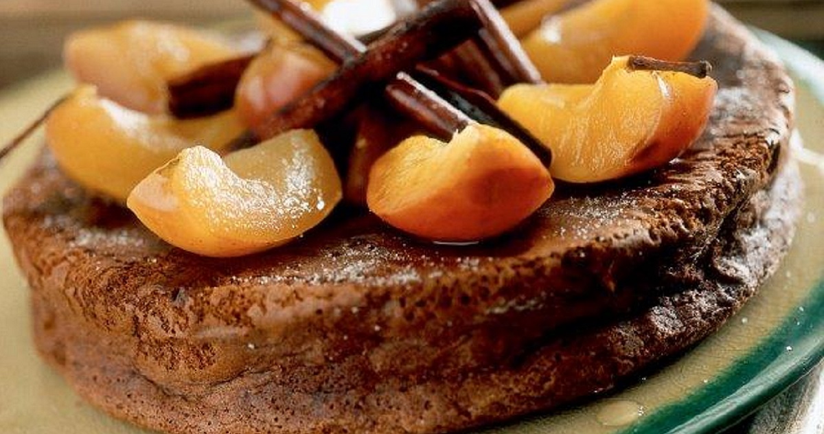 - Όση ώρα ψήνετε το κέικ ζεσταίνετε το βούτυρο σε αντικολλητικό τηγάνι και ρίχνετε τα μήλα, το χυμό λεμονιού τη ζάχαρη και τα ξυλάκια κανέλας. Τα ανακατεύετε προσεκτικά μέχρι να καραμελώσουν. Διακοσμείτε τη σοκολατόπιτα με τα καραμελωμένα μήλα και το σιρόπι τους. Σερβίρετε αμέσως.