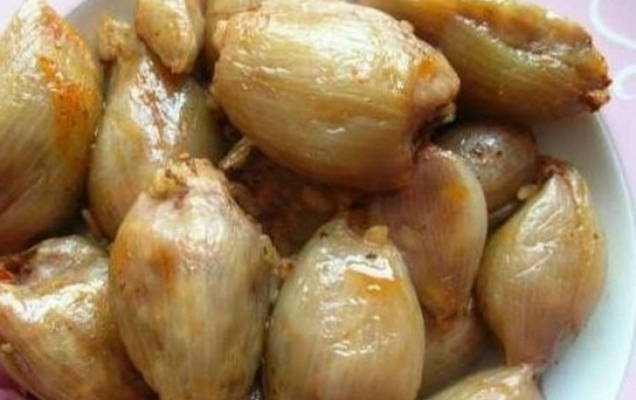 - Παίρνουμε μικρές κουταλίτσες απ' αυτό το μείγμα και γεμίζουμε ένα ένα τα κρεμμύδια.