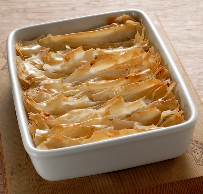 - Επαναλαμβάνετε τη διαδικασία μέχρι να τελείωσουν τα φύλλα (εκτός από ένα) και το μείγμα των τυριών. Τοποθετείτε το τελευταίο φύλλο, το σουρώνετε και σκεπάζετε την πίτα.