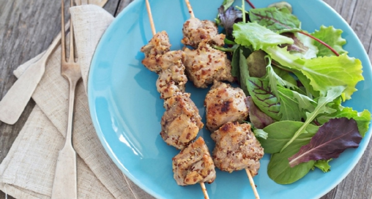 Συνταγή για σουβλάκια γαλοπούλας μαριναρισμένα σε μουστάρδα και μέλι. Light πιάτο φουλ στην πρωτεΐνη. Συνοδέψτε με φρεσκοκομμένη πράσινη σαλάτα και λίγο καστανό ρύζι για μια πιο ισορροπημένη διατροφή.