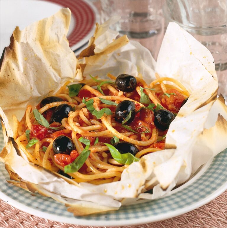 - Στρώνετε σε πυρίμαχο σκεύος αντικολλητικό χαρτί και προσθέτετε τα ζυμαρικά με τη σάλτσα τους. Κλείνετε το χαρτί και ψήνετε στους 200 βαθμούς για 10΄-12΄. Ανοίγετε προσεκτικά το χαρτί πασπαλίζετε με λίγο ακόμη βασιλικό και σερβίρετε.