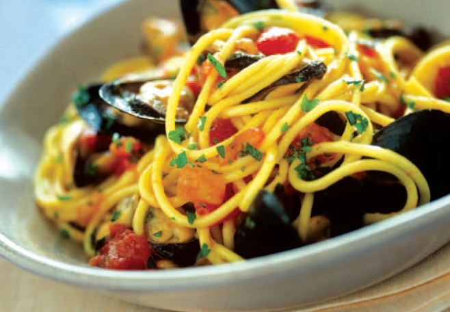 - Ξύνετε τα μύδια για να καθαρίσουν, αφαιρείτε τα «γένια τους» και τα ξεπλένετε πάρα πολύ καλά σε σουρωτήρι. Βράζετε τα ζυμαρικά σύμφωνα με τις οδηγίες της συσκευασίας τους, σε κατσαρόλα με αρκετό αλατισμένο νερό. Ρίχνετε το ελαιόλαδο, τον μαϊντανό, το σκόρδο, την καυτερή πιπερίτσα σε τηγάνι και τα σοτάρετε σε χαμηλή φωτιά.