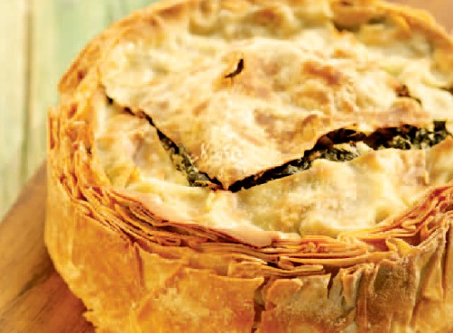 - Ετοιμάζςετε το φύλλο σύμφωνα με τη βασική συνταγή. Στρώνετε ένα φύλλο, πάλι χόρτα, πάλι φύλλο, τα υπόλοιπα χόρτα και τέλος τα 2 τελευταία φύλλα επίσης αλειμμένα με λάδι. Κόβετε με μαχαίρι τα περισσεύματα των φύλλων. Χαράζετε, αν θέλετε, την πίτα σε κομμάτια (χωρίς να φθάσει κάτω κάτω το μαχαίρι) και περνάτε το επάνω φύλλο με το υπόλοιπο λάδι και λίγο νερό. Ψήνετε για 55΄-60΄ σε μέτριο φούρνο στους 200° C.