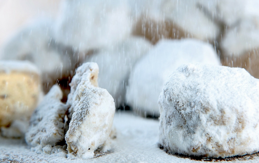 - Εν τω μεταξύ, κοσκινίζετε άφθονη άχνη ζάχαρη σε μια λαδόκολλα. Μόλις βγάλετε τους κουραμπιέδες απ’ το φούρνο, τους ραντίζετε ελαφρώς με κονιάκ και τους αφήνετε για ένα λεπτό να σταθούν στη λαμαρίνα. Τους μεταφέρετε στη λαδόκολλα με την άχνη και τους πασπαλίζετε με αρκετή ζάχαρη άχνη από πάνω. Τους αφήνετε έτσι για αρκετές ώρες, ή καλύτερα για μία νύχτα, και τους μεταφέρετε σε πιατέλα.