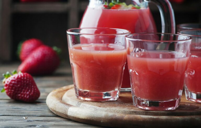 - Για να σερβίρετε το χυμό προσθέτετε δύο παγάκια σε κάθε ποτήρι, ρίχνετε το χυμό και διακοσμείτε με φέτες λάιμ ή φράουλας στο χείλος κάθε ποτηριού.