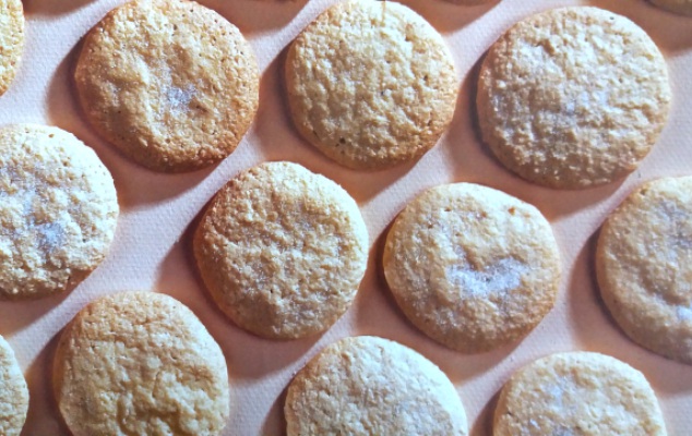 - Καλύπτουμε με αντικολλητικό χαρτί ένα ρηχό ταψί. Με μικρό κουταλάκι παίρνουμε λίγο λίγο απ' το μείγμα και το ρίχνουμε στο χαρτί. Το πατάμε να πλατύνει και του δίνουμε ελαφρώς στρογγυλό σχήμα. Επαναλαμβάνουμε μέχρι να τελειώσει το μείγμα αφήνοντας μια απόσταση μεταξύ των μπισκότων γιατί κατά το ψήσιμο θα πλατύνουν κι άλλο.