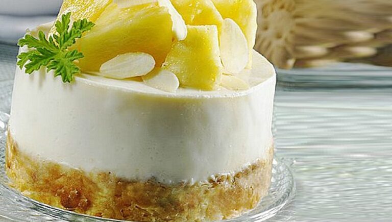 - Σε ένα μπολ βάζουμε όλα τα υλικά για την κρέμα και τα ανακατεύουμε καλά. Βγάζουμε την τάρτα από το ψυγείο και ρίχνουμε την κρέμα με ακανόνιστες κουταλιές μέχρι να σκεπάσουμε όλη την τάρτα. Γαρνίρουμε με φέτες ανανά και με αμύγδαλο και σερβίρουμε. Tip Αν θέλουμε σερβίρουμε κατευθείαν από το ταψάκι, οπότε δε χρειάζεται και αντικολλητικό χαρτί.