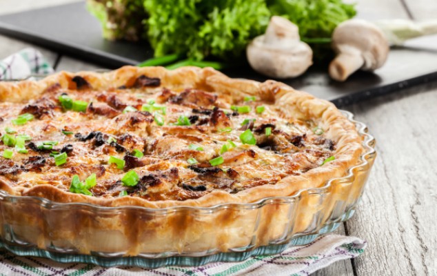 - Στρώνετε μια φόρμα για τάρτα με τη σφολιάτα και κόβετε τα περισσεύματα στις άκρες. Ρίχνετε στη φόρμα το μείγμα των λαχανικών και του κοτόπουλου και το απλώνετε ομοιόμορφα μέσα στη ζύμη.