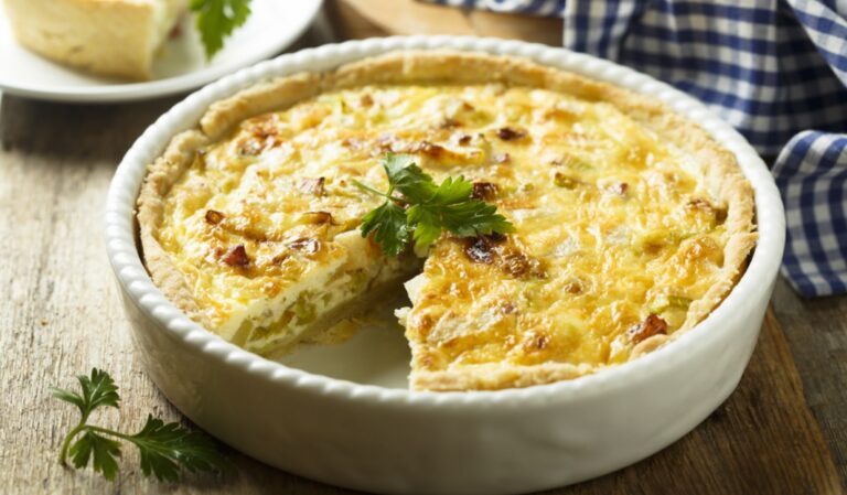 Πικάντικο, βουτυράτο και κρεμμώδες έδεσμα που θέλει οπωσδήποτε κρασί με οξύτητα, για να αποκτήσει σπιρτάδα και να απογειωθεί. Ένα λευκό κρασί από την αρωματική ποικιλία Traminer, ένα ροζέ ημίξηρο αφρώδες ή, για μια περισσότερο διαφοροποιημένη εκδοχή, ένα γλυκό κρασί με δυνατή οξύτητα, όπως, για παράδειγμα, ένα Sauternes.