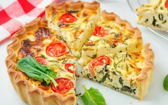 - Απλώνετε το μείγμα στην ψημένη βάση της τάρτας. Χτυπάτε τα αυγά με τη κρέμα γάλακτος και περιχύνετε τη γέμιση κουνώντας ελαφριά το σκεύος να πάει παντού. Διακοσμείτε την επιφάνεια με τα ντοματίνια πιέζοντας ελαφρά να μισοβυθιστούν στη γέμιση. Ψήνετε την τάρτα σε προθερμασμένο φούρνο στους 200° C για 30'-35'.