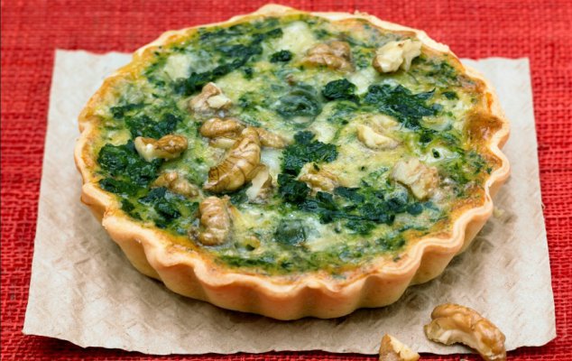 - Στρώνετε μια αντικολλητική φόρμα ή μια ταρτιέρα, αφού τη βουτυρώσετε, με το φύλλο ζύμης ώστε να καλυφτεί ο πάτος και τα πλαϊνά της. Κόβετε τα περισσεύματα της ζύμης στις άκρες και τρυπάτε τη ζύμη με πιρούνι σε διάφορα σημεία. Απλώνετε σε μια στρώση το μείγμα με σπανάκι τα τυριά και τα καρύδια.