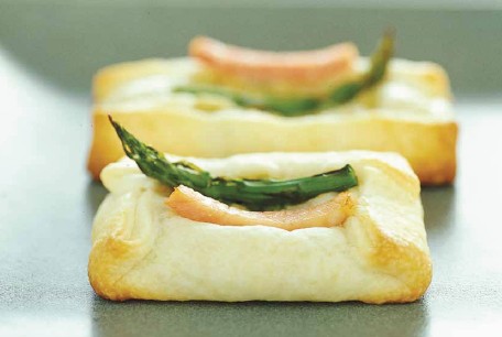 Για να φτιάξετε τα ατομικά ταρτάκια της φωτογραφίας, κόβετε τη σφολιάτα σε 4 ορθογώνια φύλλα, τα βάζετε σε ορθογώνια τσέρκια ή θήκες, βάζετε τη γέμιση με τα σπαράγγια και το ζαμπόν, μοιράζετε το μείγμα των αυγών και της κρέμας, ανασηκώνετε τις άκρες τους και τα ψήνετε για 7’-8’.