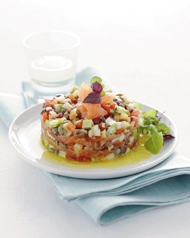 - Κόβετε τον φρέσκο σολομό και τον καπνιστό σολομό σε κυβάκια του 1/2 εκατοστού και τα τοποθετείτε σε ένα μπολ. Προσθέτετε το χυμό ντομάτας το ξίδι και λίγο άνηθο ψιλοκομμένο. Το σκεπάζετε και το αφήνετε να μαριναριστεί τουλάχιστον δύο ώρες στο ψυγείο.