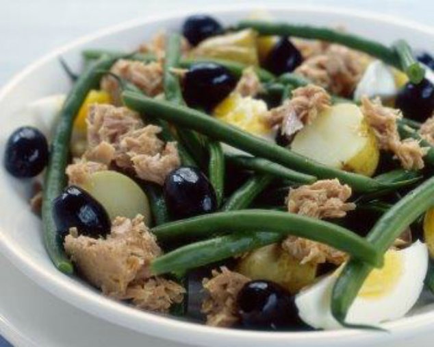 - Σε μια πιατέλα βαθιά αναμειγνύετε τον τόνο κομματιασμένο και στραγγισμένο από το λάδι του, τα φασολάκια, τις πατάτες, τα αυγά κομμένα στα τέσσερα, το μαϊντανό, τις ελιές, τα κρεμμυδάκια, αλάτι και πιπέρι. Χτυπάτε σε μπολ το ελαιόλαδο με τη μαγιονέζα, το ξίδι και το σκόρδο και περιχύνετε τη σαλάτα.