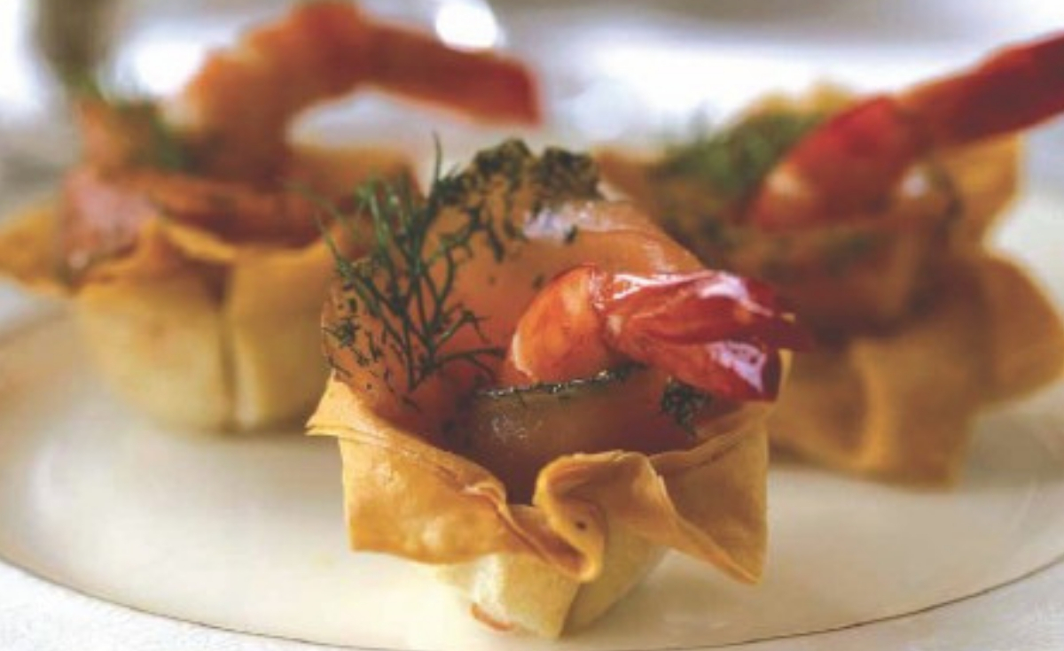 - Στραγγίζετε τις γαρίδες και τις περιχύνετε με λίγο λάδι και λεμόνι. Τις τυλίγετε στη μια άκρη με μια λωρίδα σολομού και πιπέρι και τις πιέζετε μέσα στο μείγμα των τυριών. Ψήνετε τα ταρτάκια για 2’ σε δυνατό φούρνο ή στο γκριλ. Πασπαλίζετε με τον υπόλοιπο άνηθο και πιπέρι και σερβίρετε.