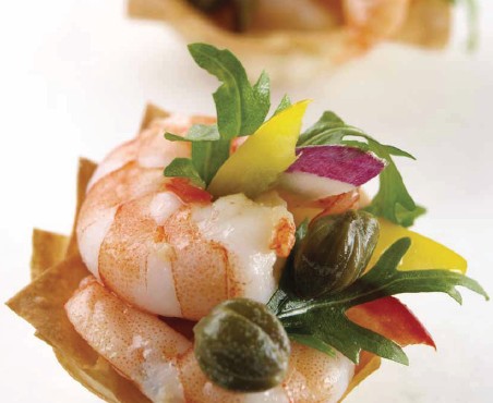 - Ανακατεύετε τη σάλτσα ντομάτας με την πιπεριά, τις ελιές και το μαϊντανό ή το βασιλικό, προσθέτετε λίγο αλατοπίπερο και τη μοιράζετε στις τραγανές φωλιές. Γαρνίρετε κάθε φωλιά με 2 γαρίδες, με κάππαρη και κομματάκια πιπεριάς.