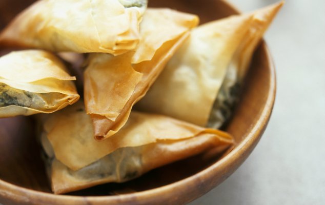 - Tυλίγετε τη λωρίδα με τη γέμιση σε τρίγωνο, αλείφετε την επιφάνεια του τρίγωνου με ελαιόλαδο και λιωμένο βούτυρο και τοποθετείτε τα τρίγωνα πιτάκια σε ταψί επίσης λαδωμένο. Ψήνετε στους 200° C τα πιτάκια για 30-35΄, μέχρι να ροδίσουν.