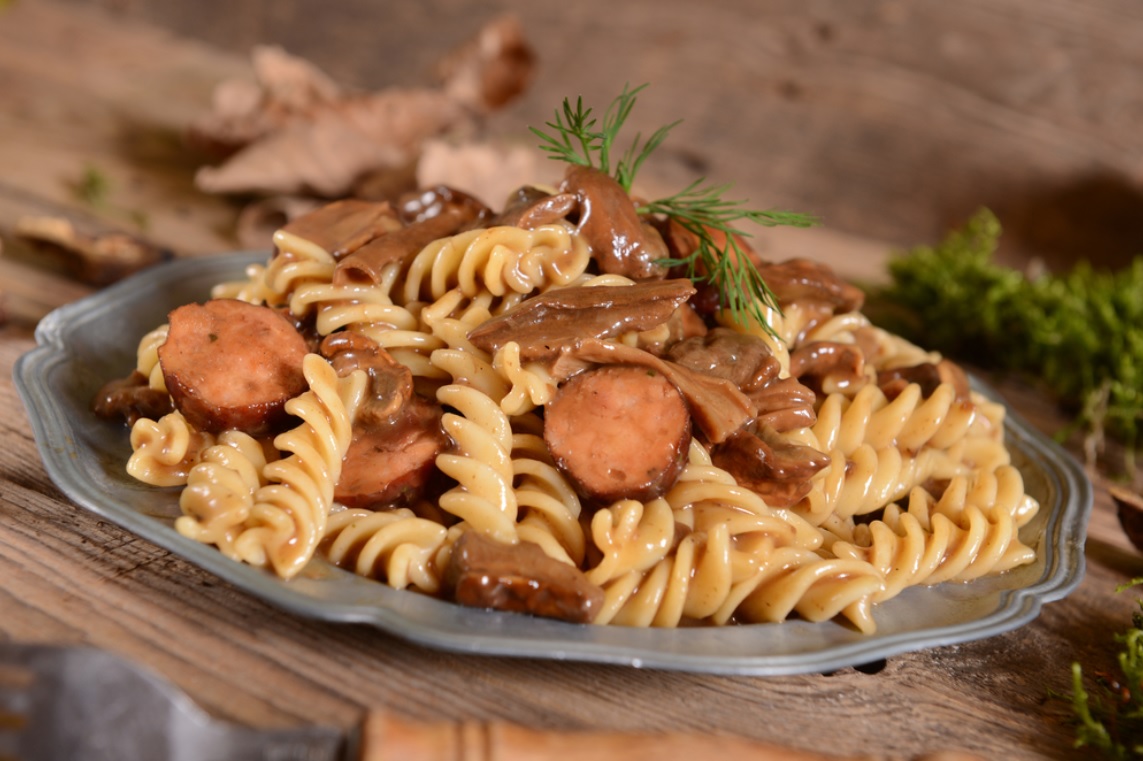 - Βράζετε το τριβελάκι με σύμφωνα με τις οδηγίες της συσκευασίας του, σουρώνετε και μοιράζετε στα πιάτα συνοδεύοντας τα ζυμαρικά με τη σάλτσα μανιταριών-λουκάνικων. Πασπαλίζετε, αν θέλετε, με τριμμένο τυρί.