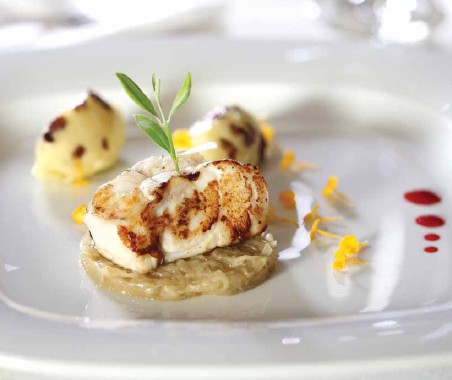 Παρόλο που περιέχει καραμελωμένα κρεμμύδια, αυτό το πιάτο δεν είναι βαρύ, κι ακόμα κι οι ελιές Καλαμών, λόγω της μικρής τους ποσότητας αρκούν να δώσουν απλώς μια πινελιά χωρίς να σκεπάσουν την ένταση του ψαριού. Έτσι θα επιλέξουμε, από τον Θηραϊκό αμπελώνα ένα Νυχτέρι του 2008 ή του 2009 που θα συνοδεύσει διακριτικά την τσιπούρα και θα σπάσει την παχιά υφή του πουρέ.