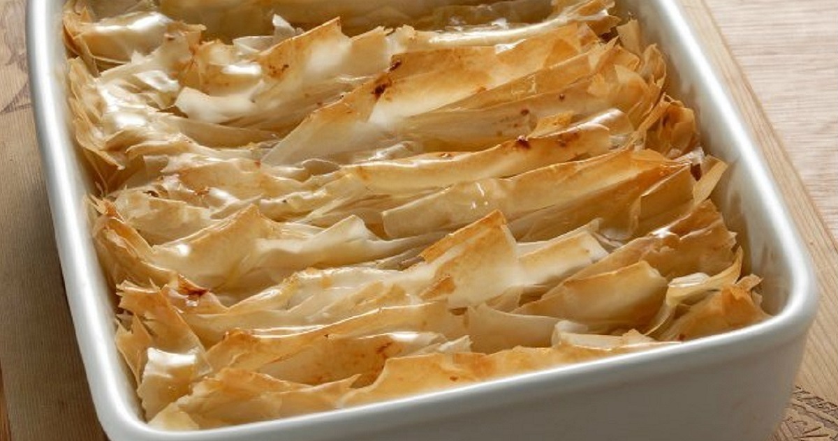 - Συνεχίζετε την ίδια διαδικασία μέχρι να τελειώσουν τα φύλλα κρούστας τοποθετώντας τα ρολά το ένα δίπλα στο άλλο να εφάπτονται. Ανακατεύετε το γάλα με ένα αυγό και περιχύνετε την πίτα. Ψήνετε σε προθερμασμένο φούρνο στους 180° C για 50′.
